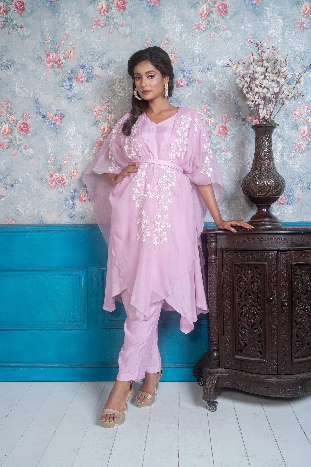 Embroidered Ombre Cape With Crop Top And Drape Skirt