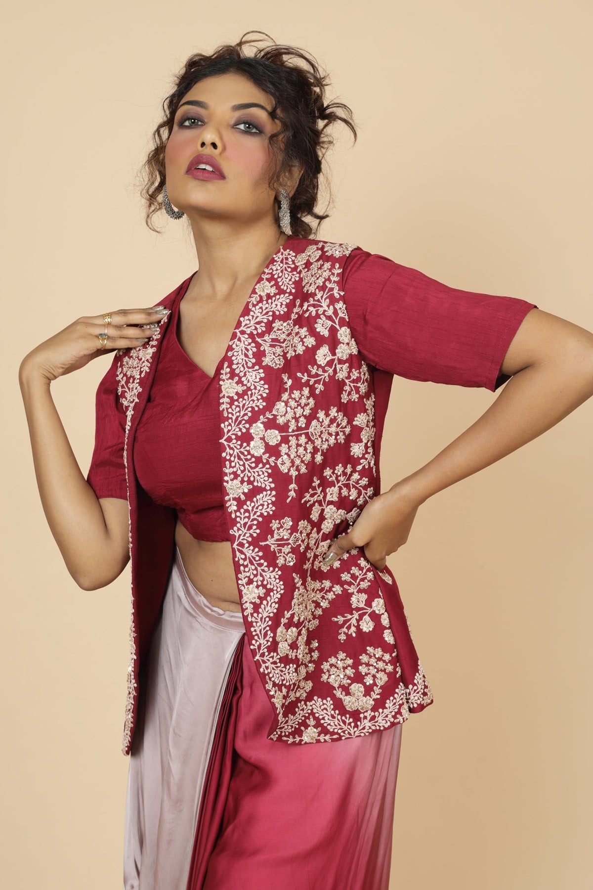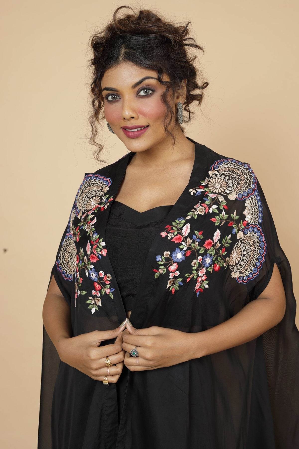 Embroidered Ombre Cape With Crop Top And Drape Skirt